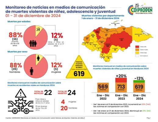 Honduras cerró el año 2024 con 619 muertes violentas de niñas, niños, adolescentes y jóvenes